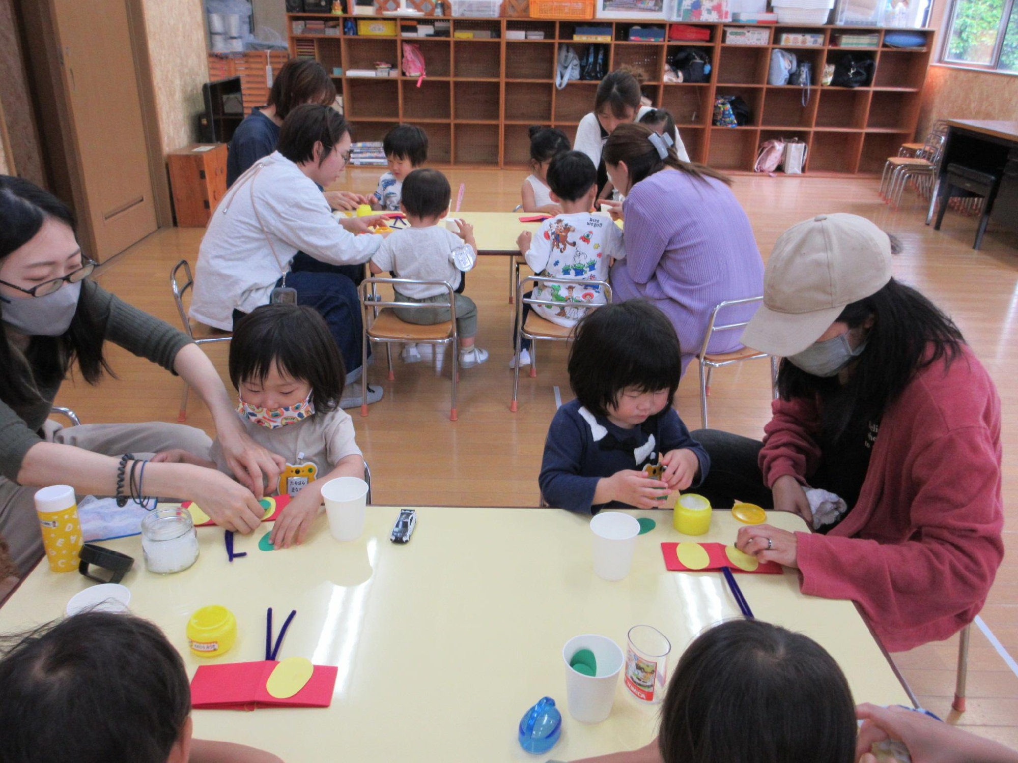 今回は、あおむしくんのお面を作って、はらぺこあおむしに変身しましたね。最初にはらぺこあおむしの絵本を皆で見ました。あおむしくんがちょうちょになった時には、みんなにこにこの笑顔でした。(*^-^*)お面作りでは、初めての糊にも挑戦!お母さん指を使ってあおむしくんの目をペタペタ。とっても上手でしたよ。(^o^)完成後は、あおむしくんになりきって、サーキットを行いました。りんごのフラフープをぴょんぴょんしたり、お菓子の一本橋を渡ったり、さなぎになって木にぶら下がったり、最後は、ちょうちょになってトランポリンをぴょんぴょんして、お花にタッチ🦋楽しい冒険の1日でした。