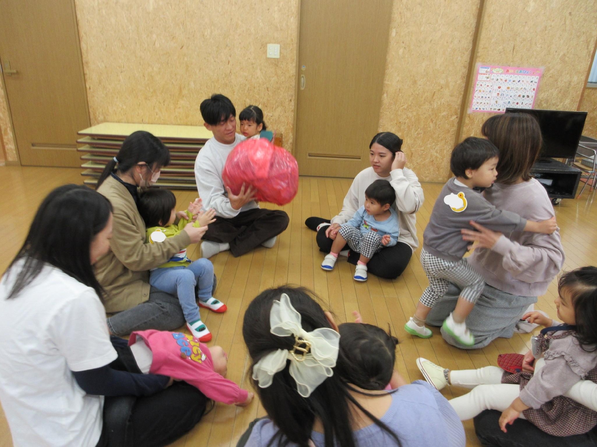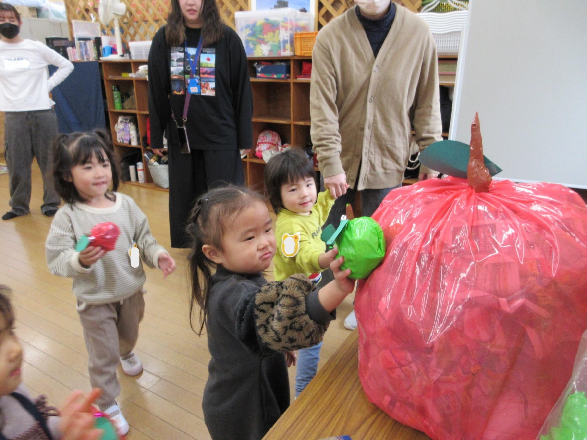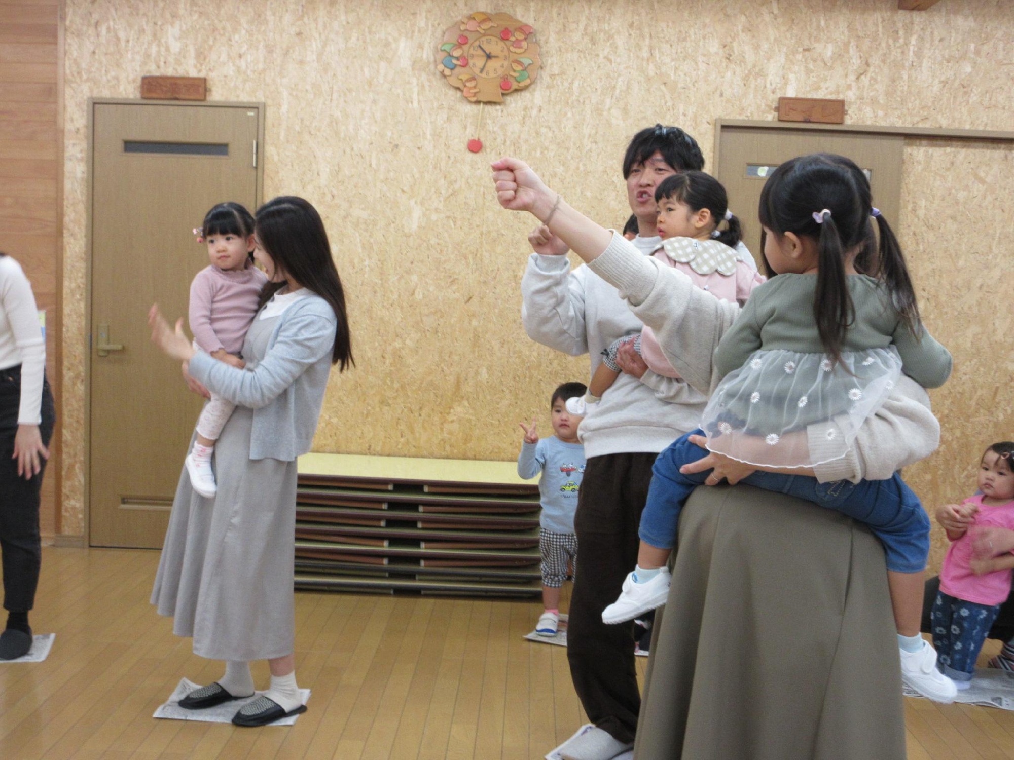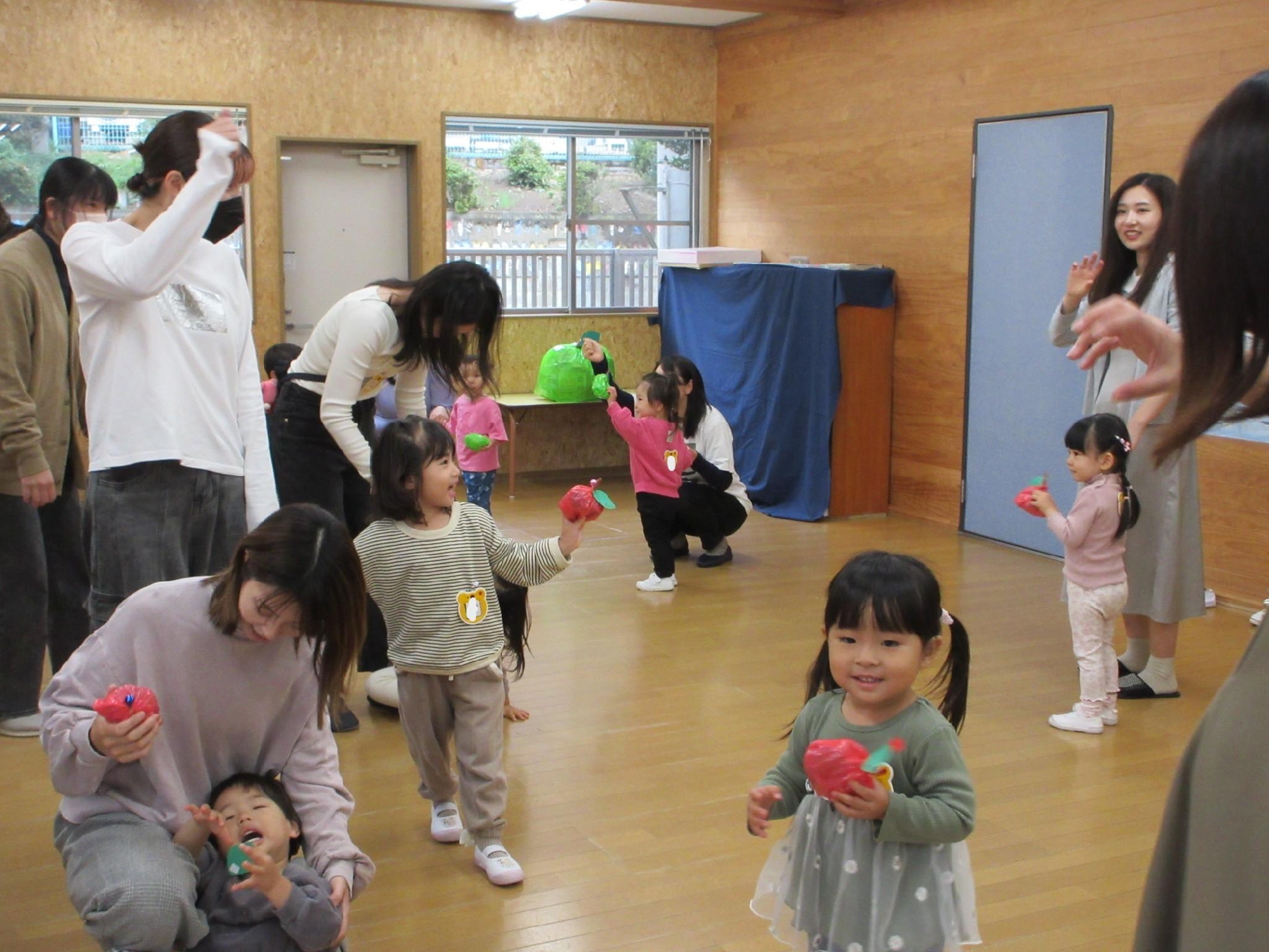 まつぼっくりの替え歌で「りんごの実があったとさ♪」を歌いながら、お隣のお友達に大きなりんごを渡していきました!