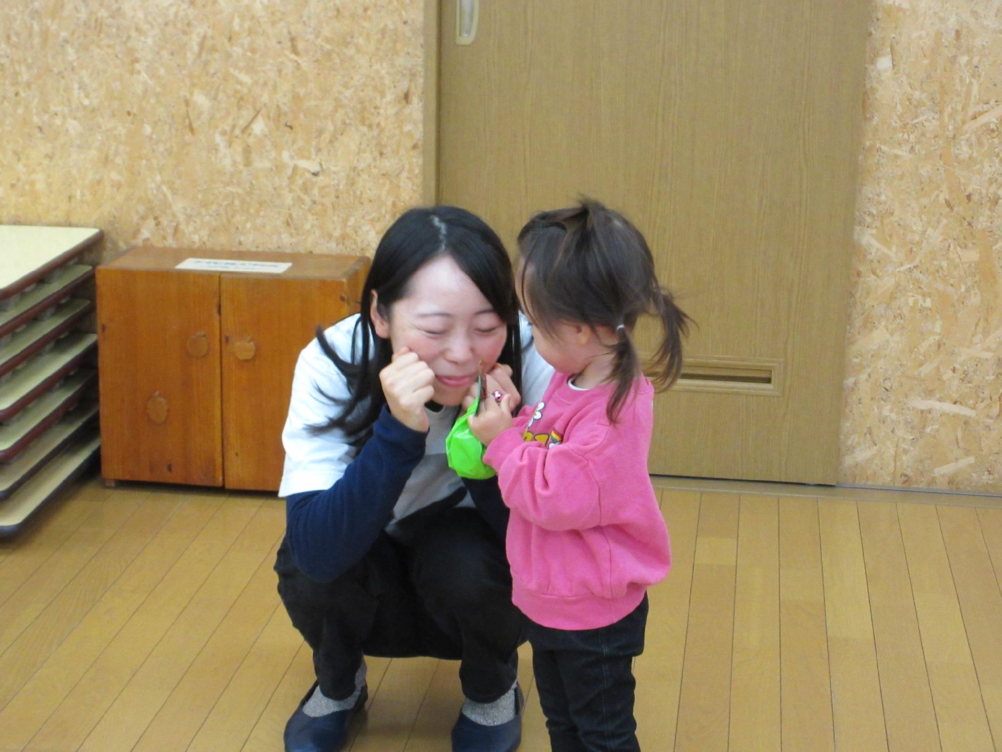 円になってお歌に合わせてりんごを回していくゲームをしました。