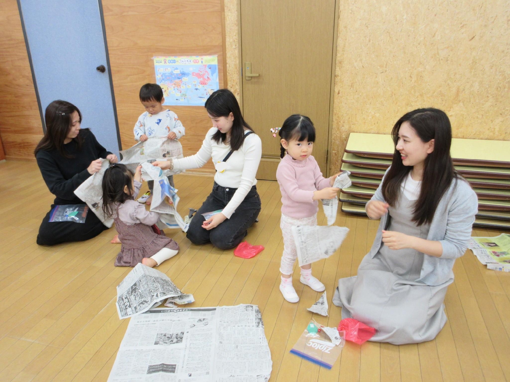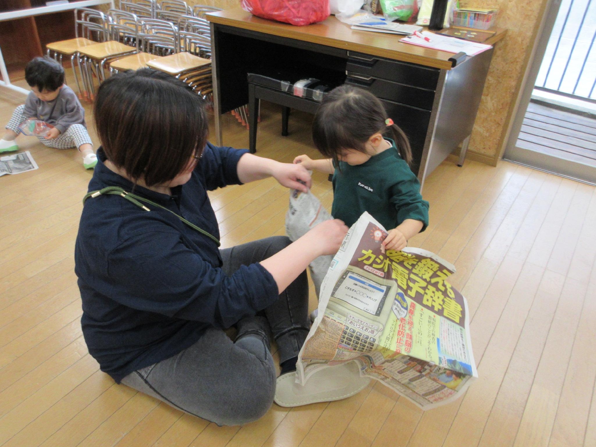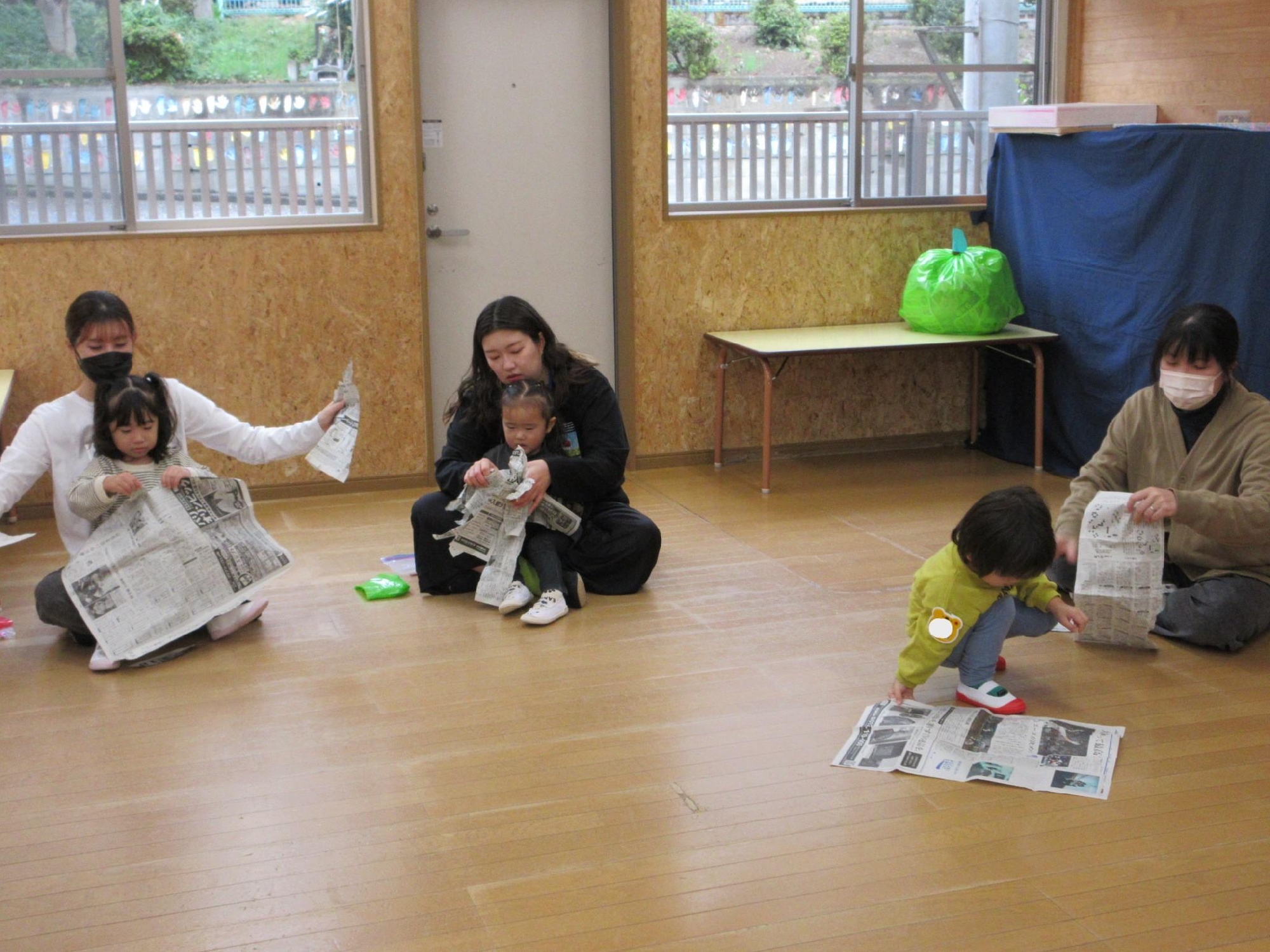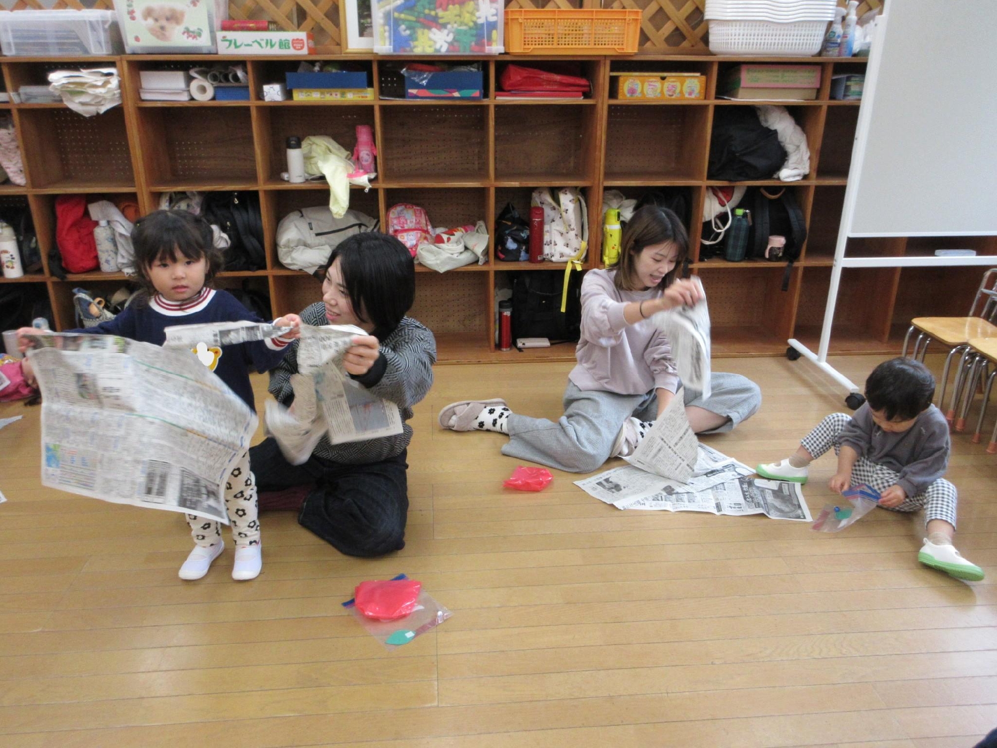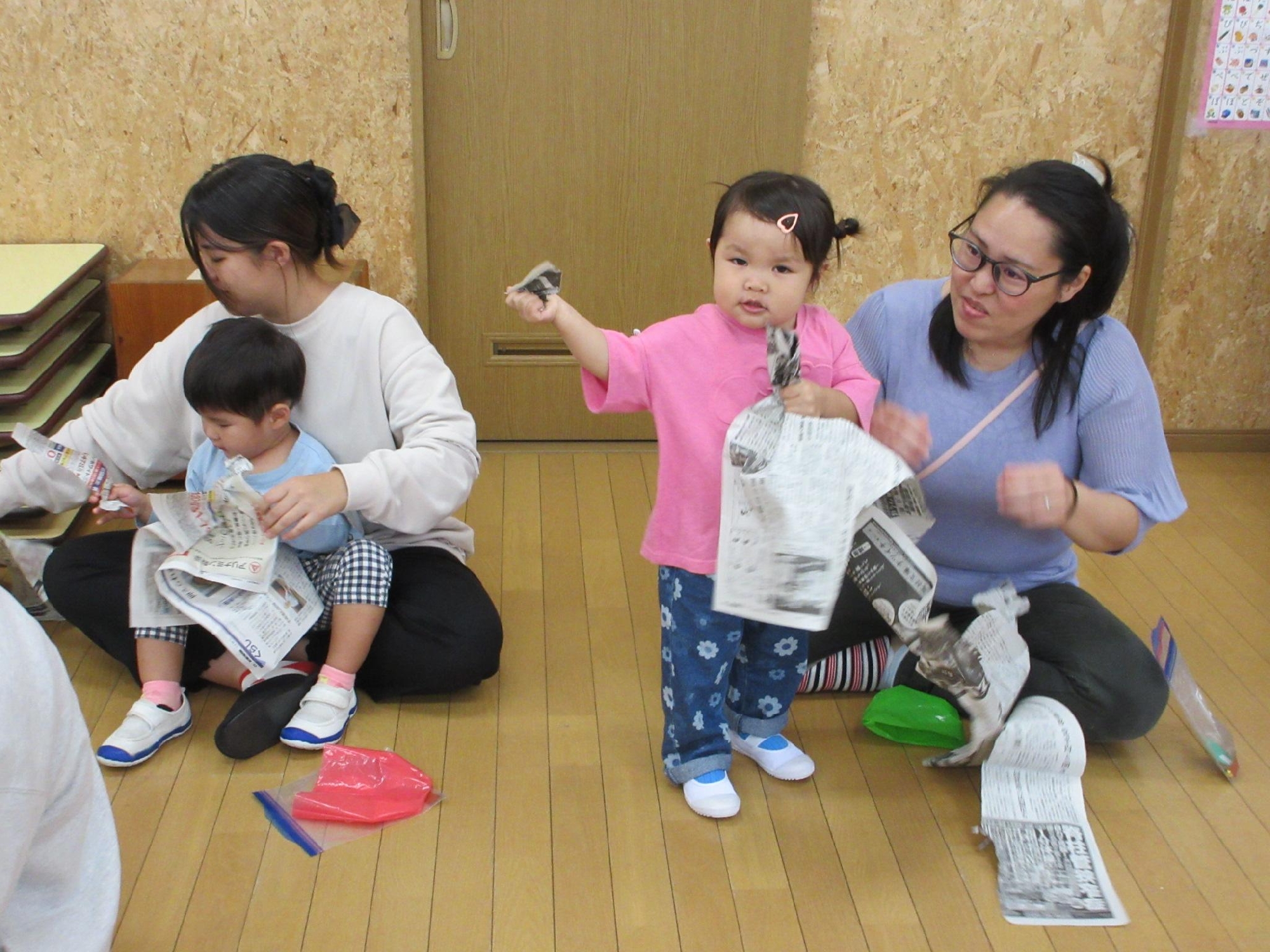 新聞紙のゲームが終わった後は、新聞紙をびりびり破ってりんごのすずを作りました。