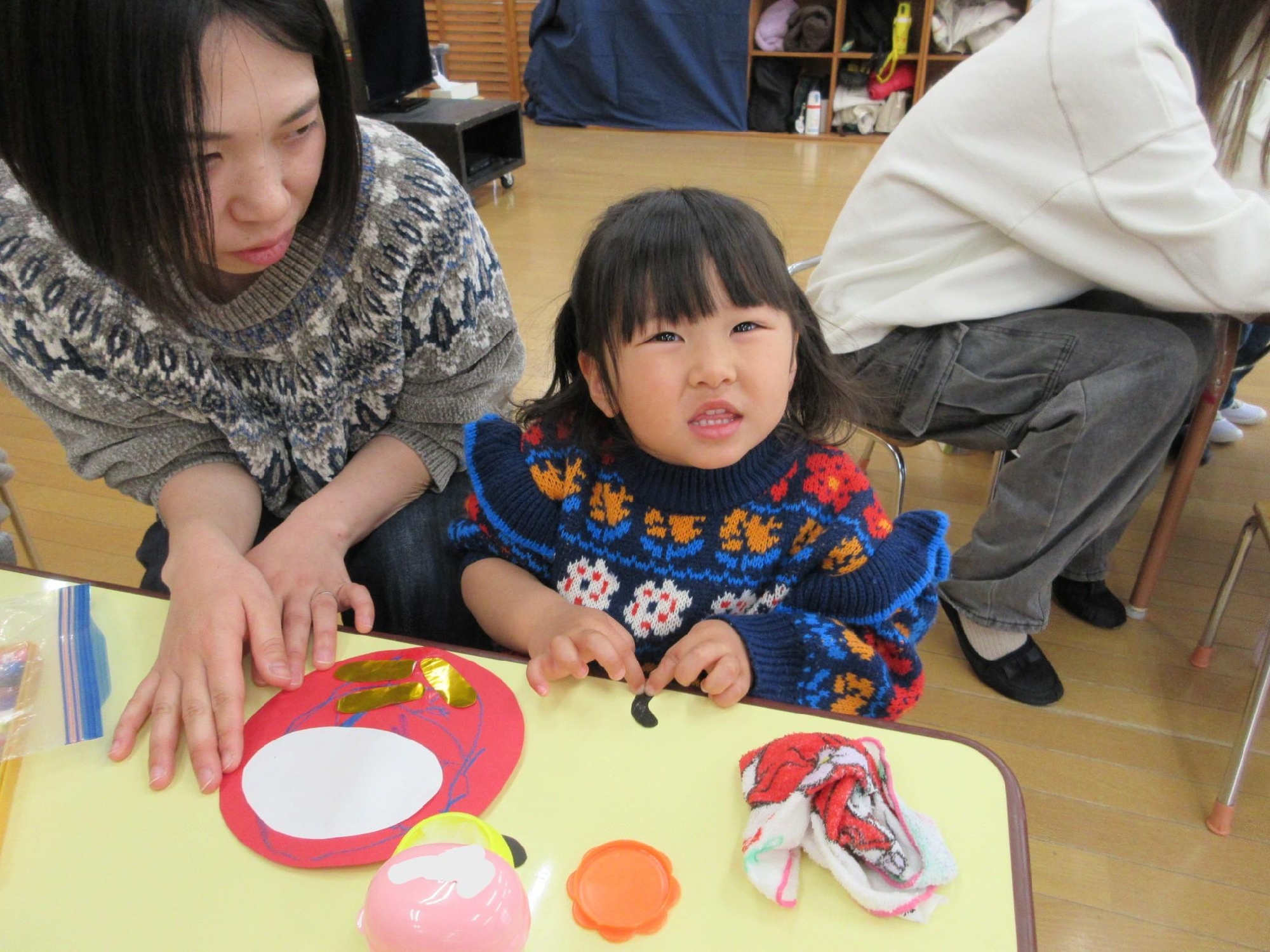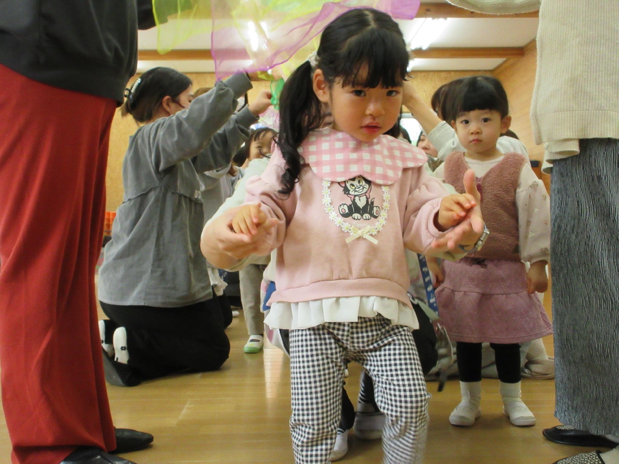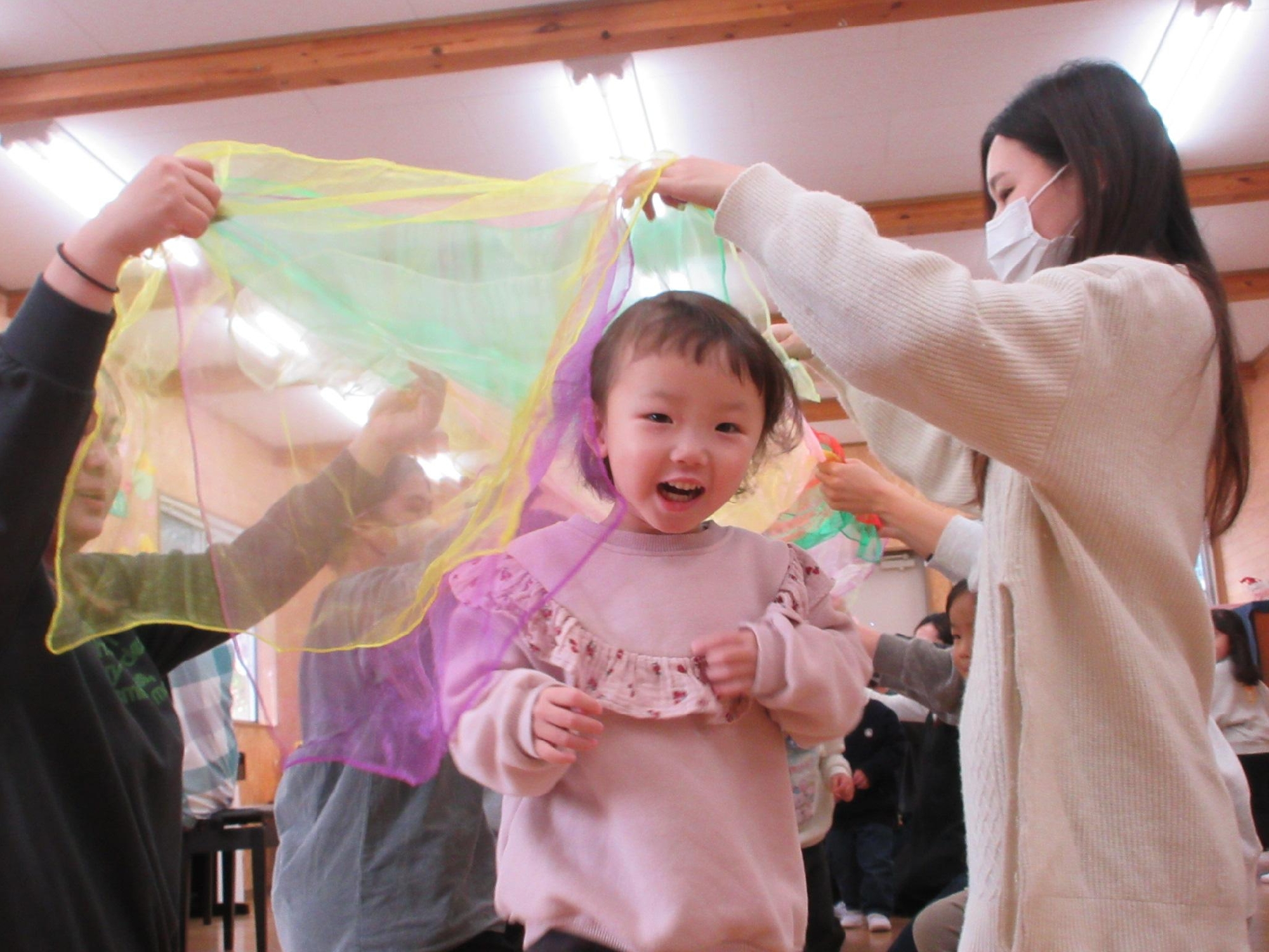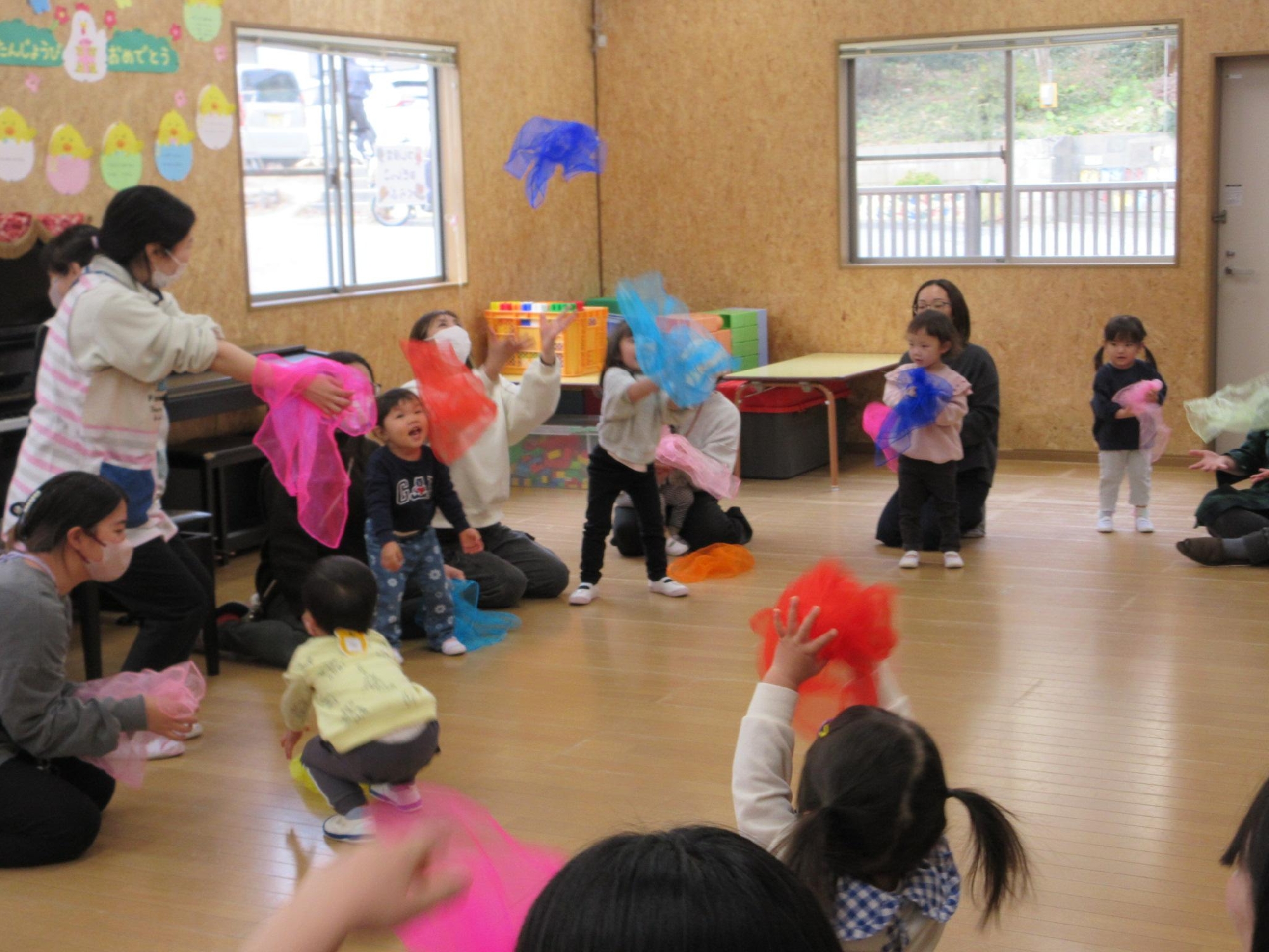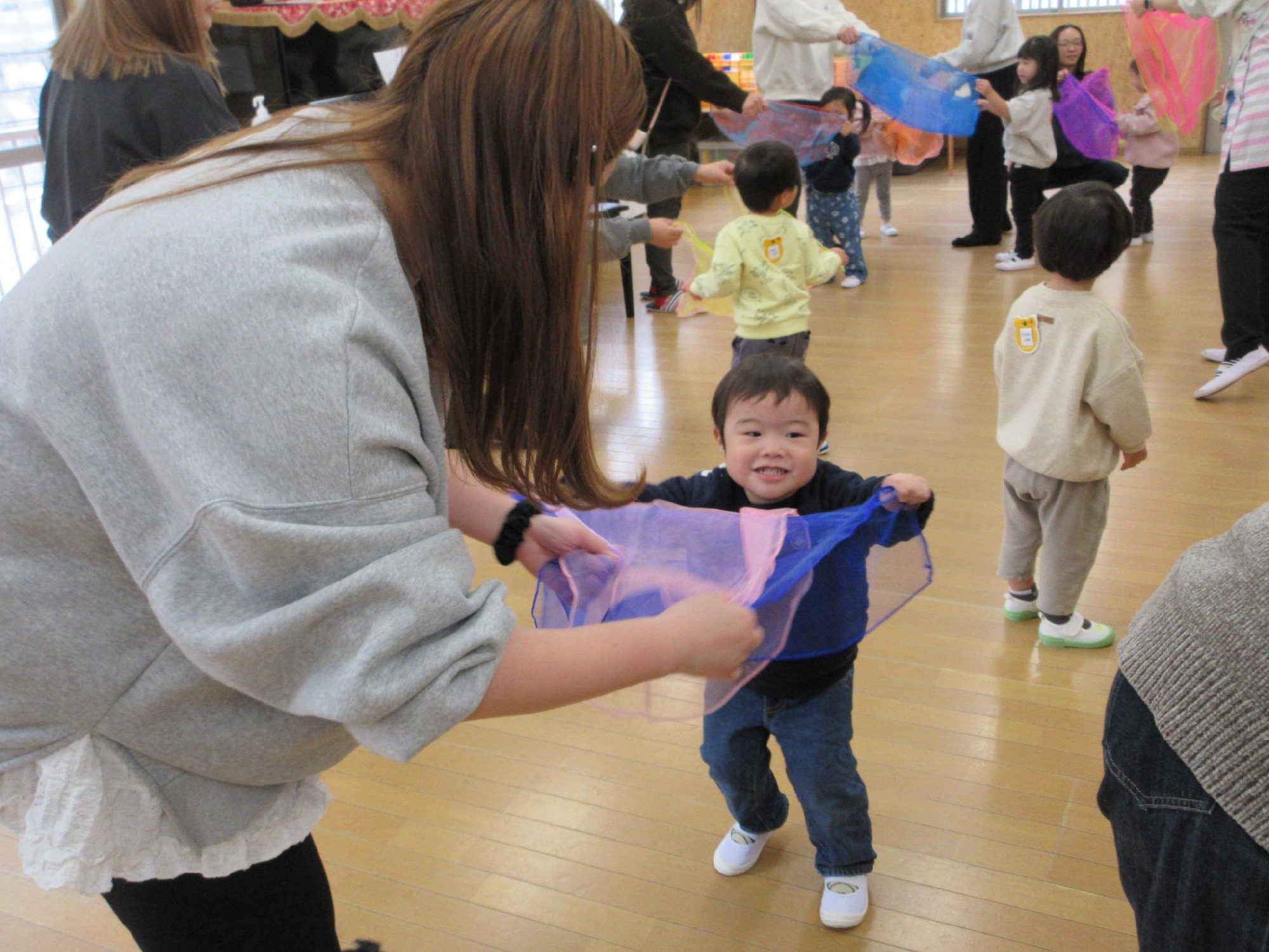 スカーフを投げたり、お母さんと一緒に持って揺れたりしたあとは・・