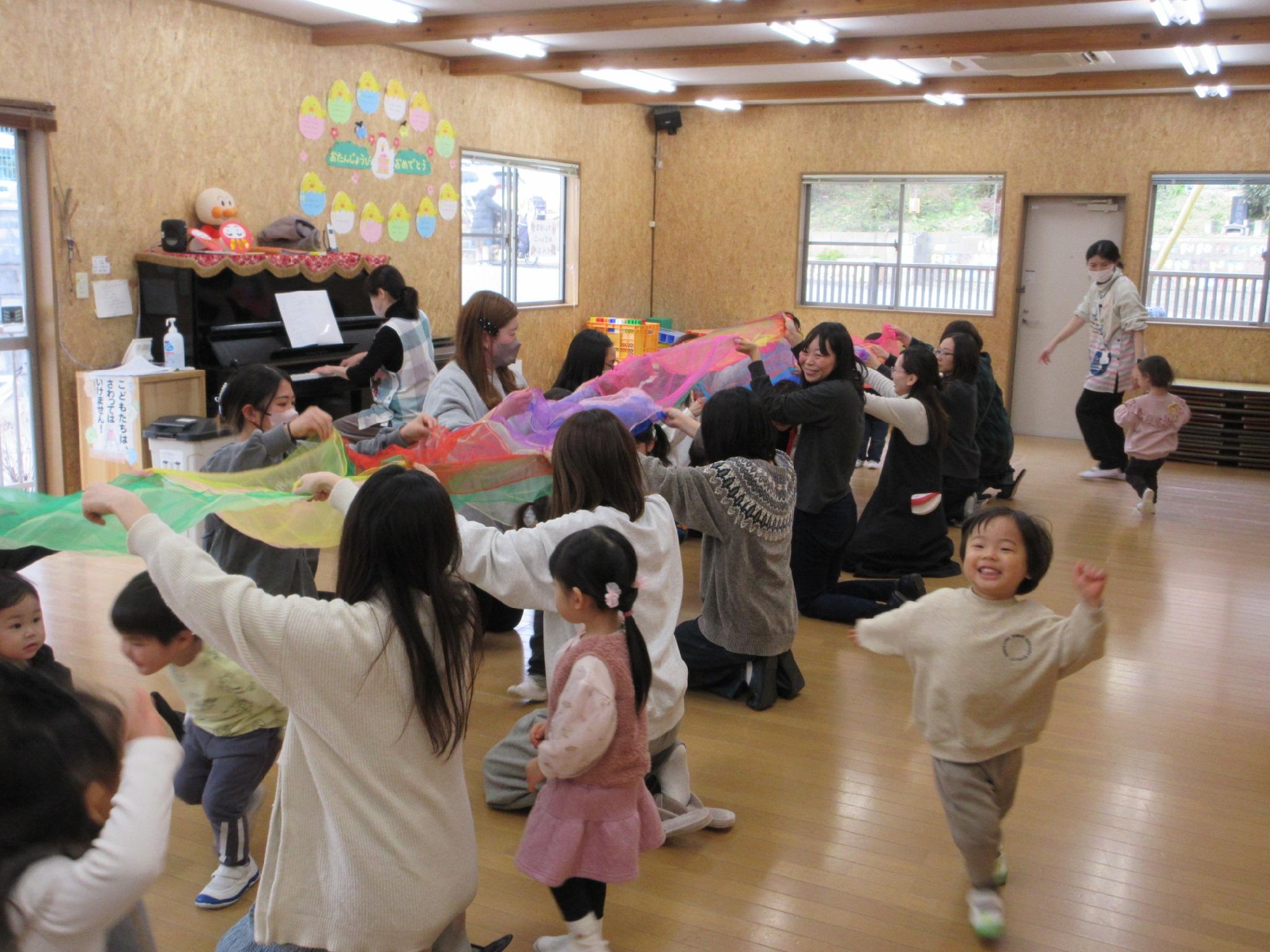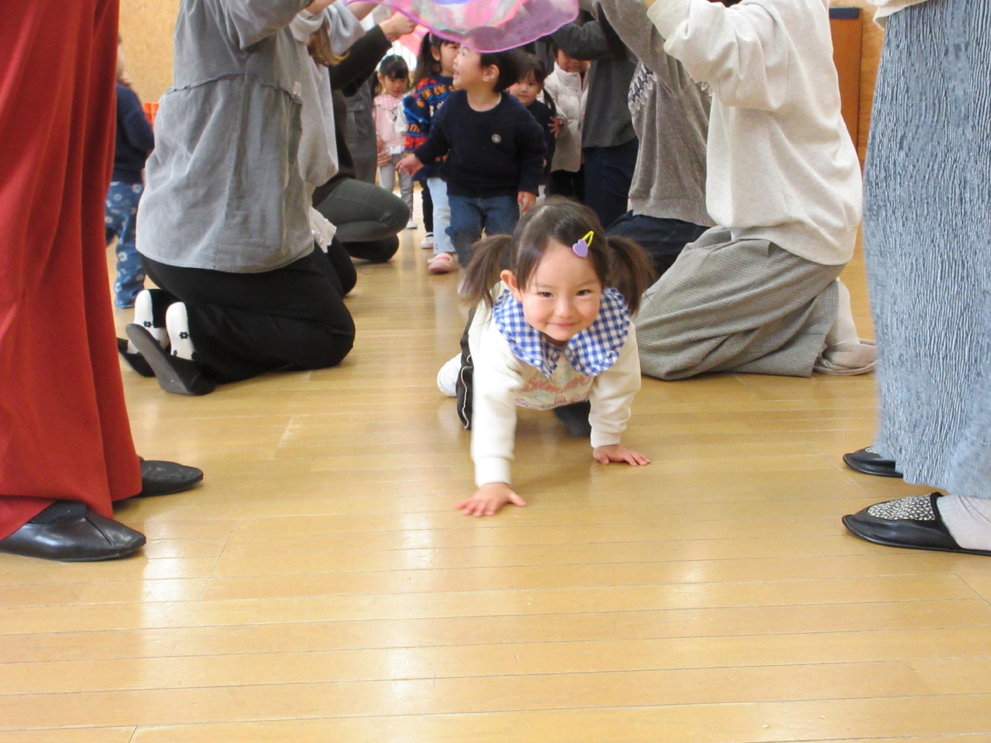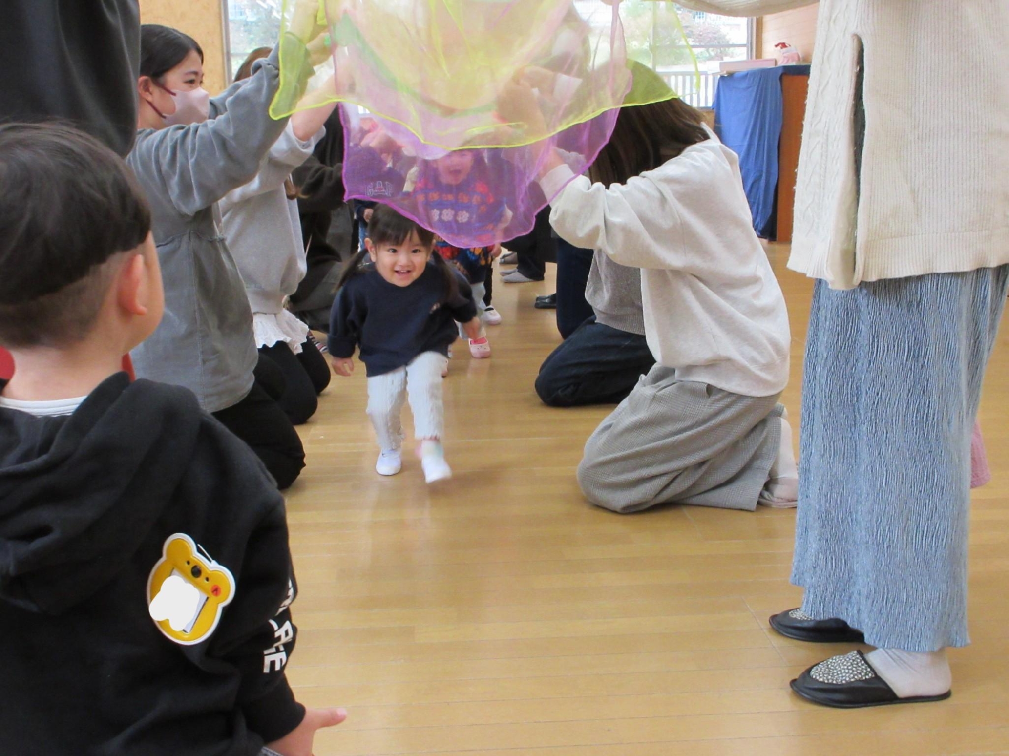 お母さんたちが作った虹のトンネルを、子ども達が渡り歩きました☺