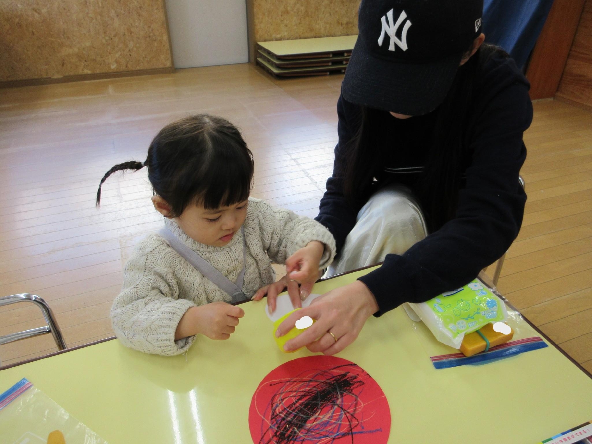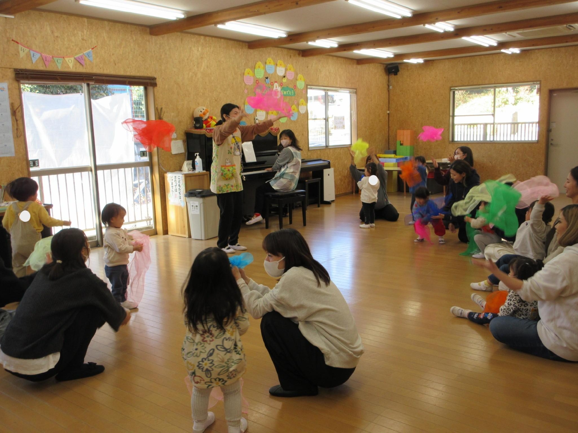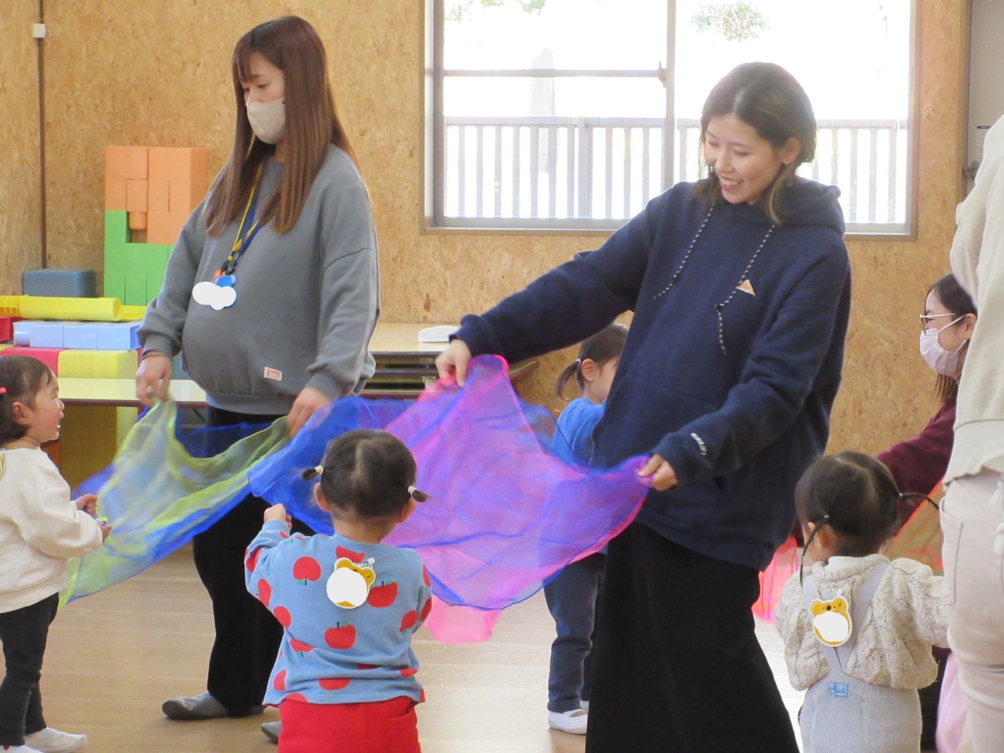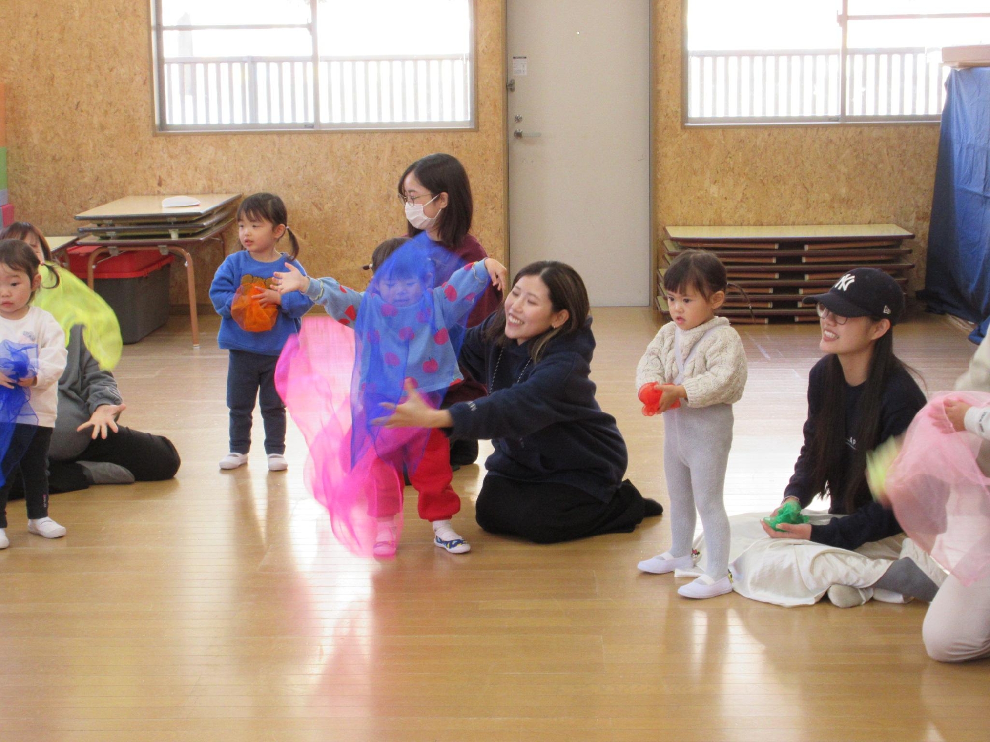 スカーフを投げたり、お母さんと一緒に持って揺れたりしたあとは・・