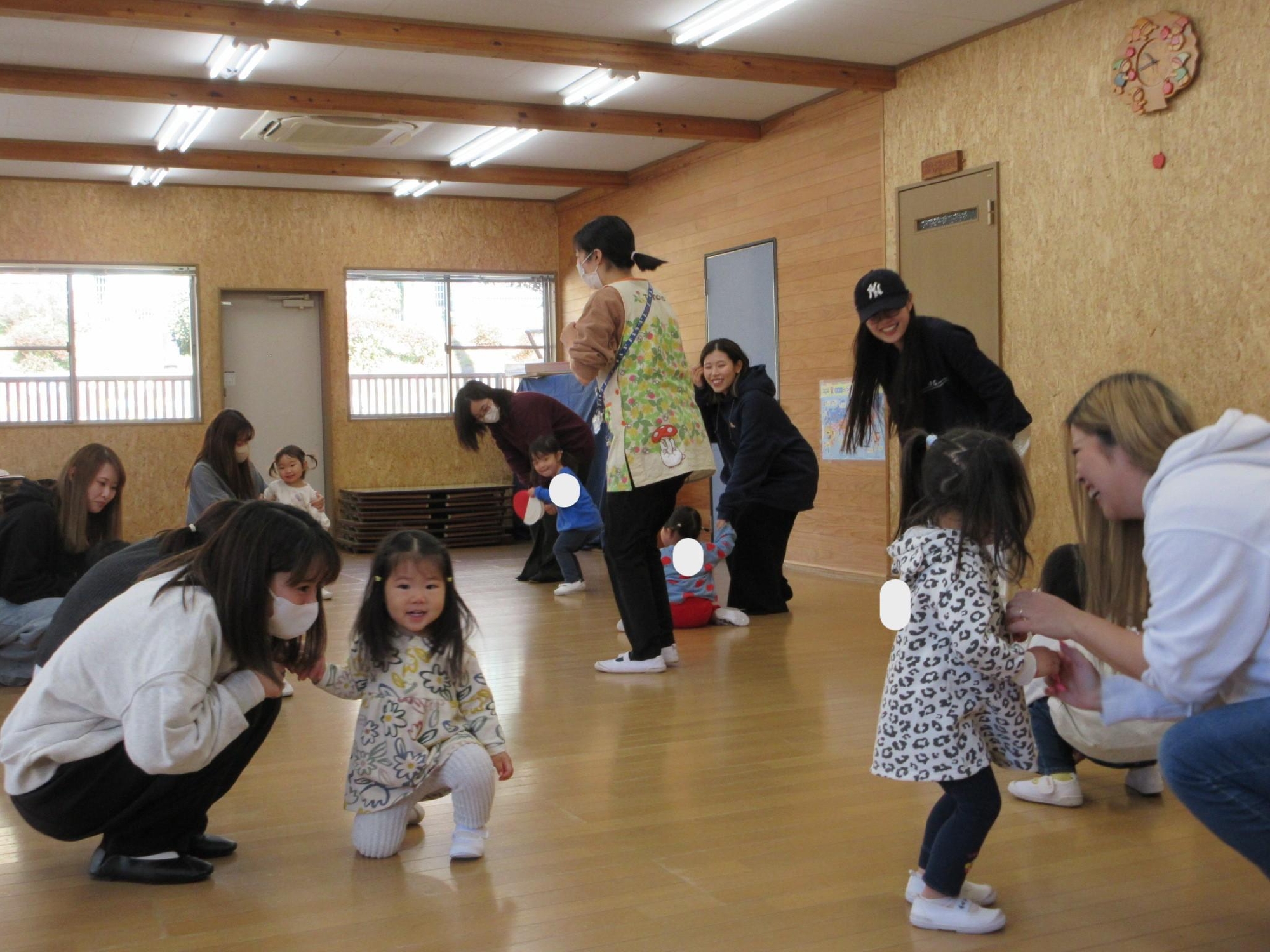 お母さんと一緒にだるまさんになりきって揺れたり、