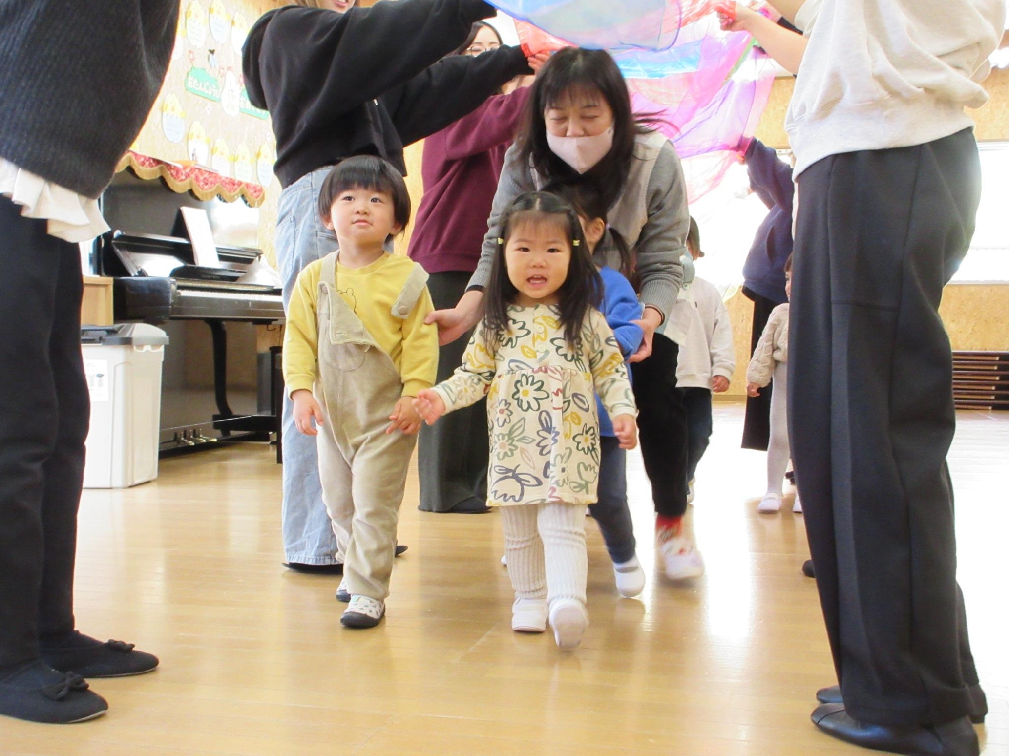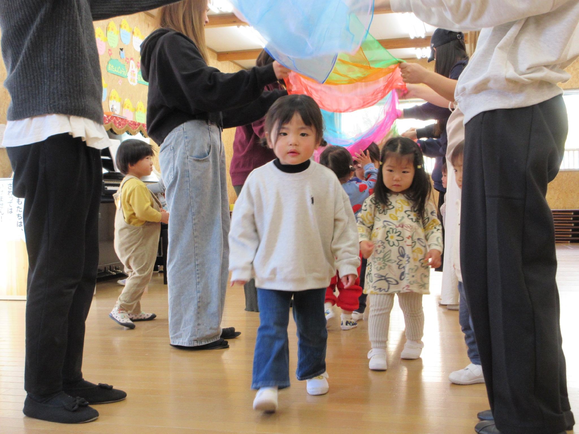 お母さんたちが作った虹のトンネルを、子ども達が渡り歩きました☺