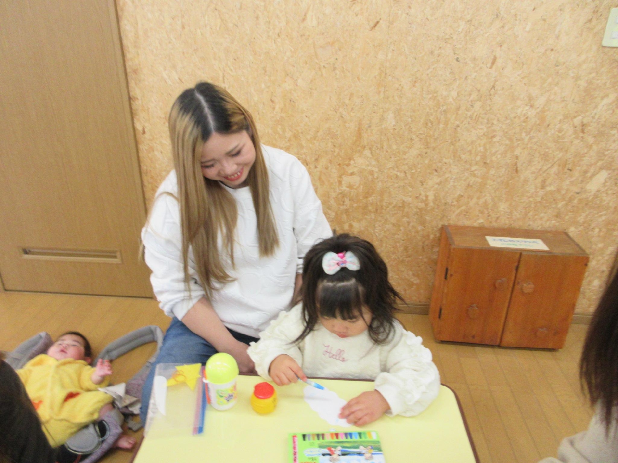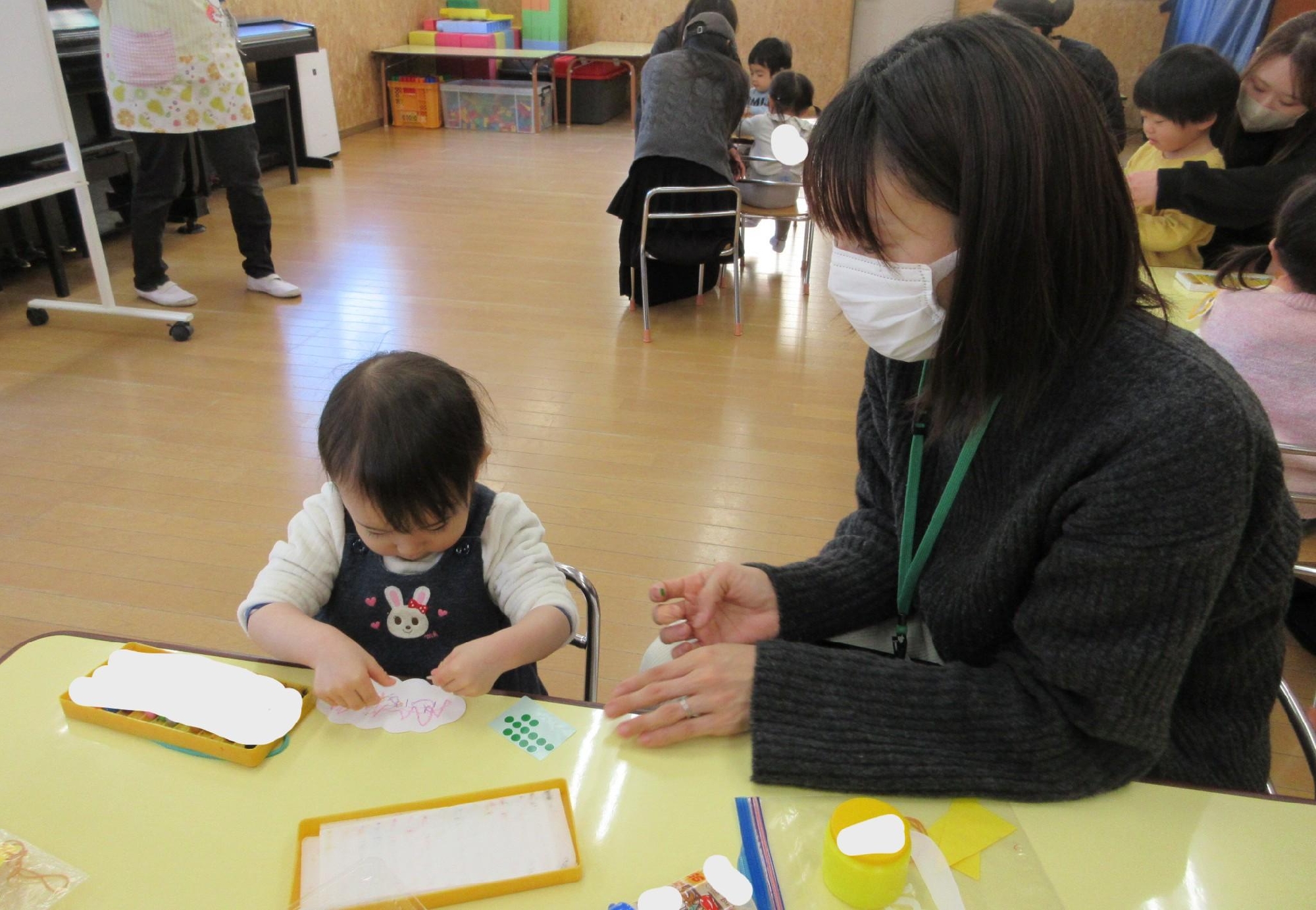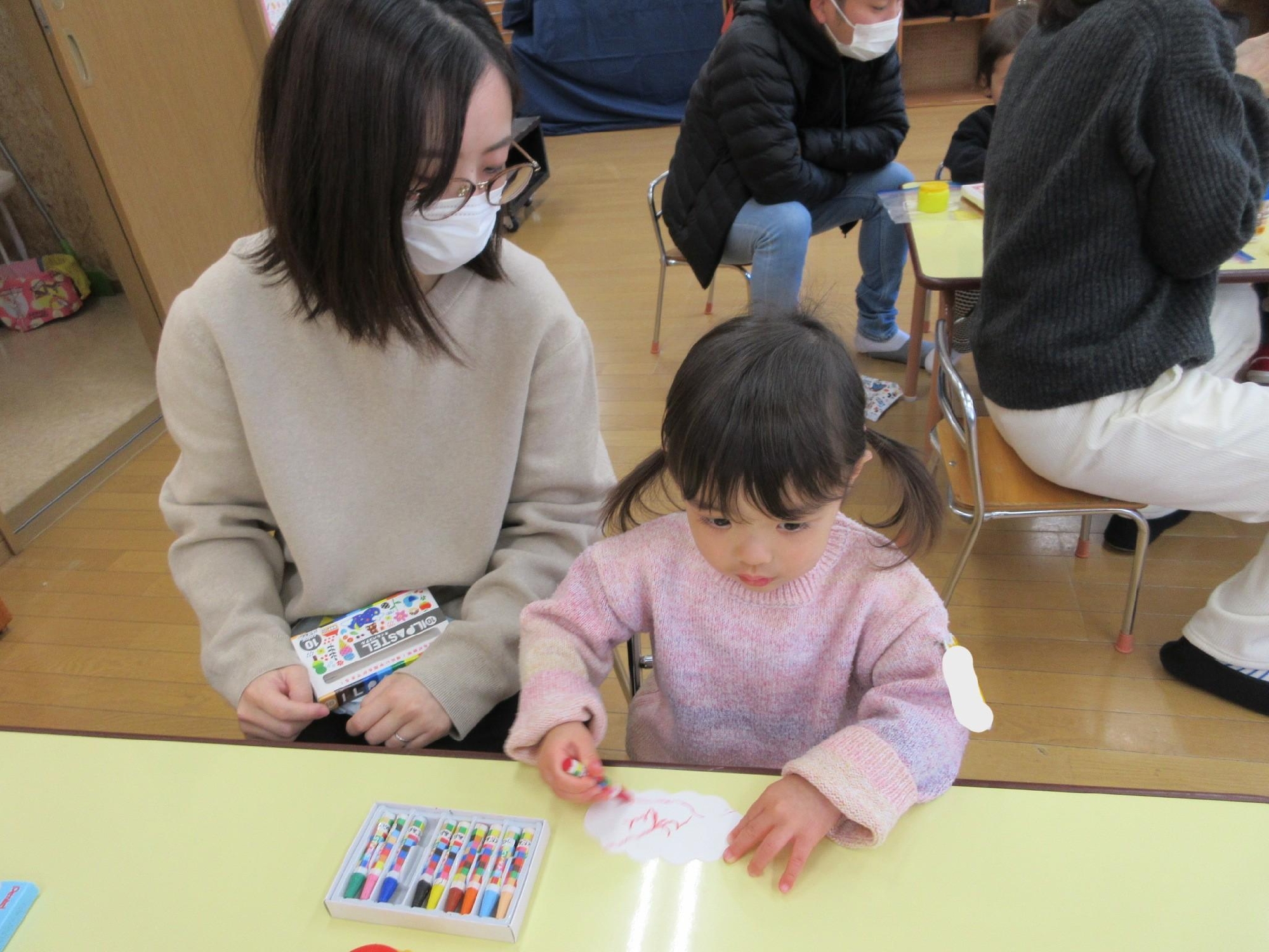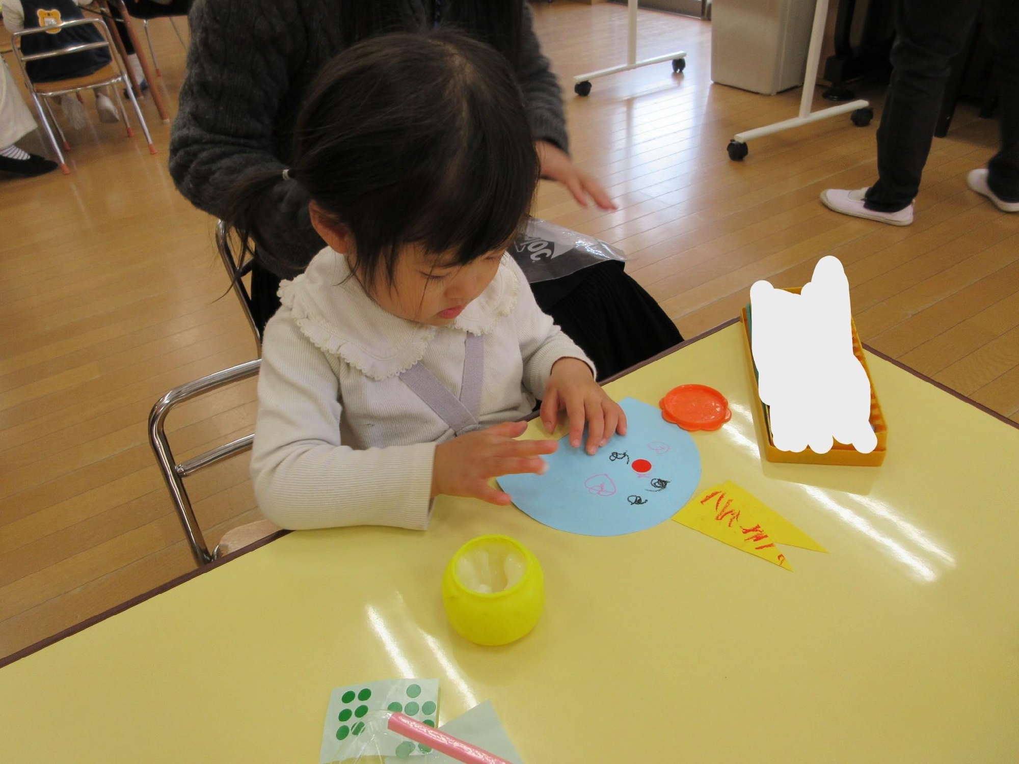 先生のお話を聞いて、鬼の髪の毛を塗ったり、シールを貼ったり、のりで貼ったり・・